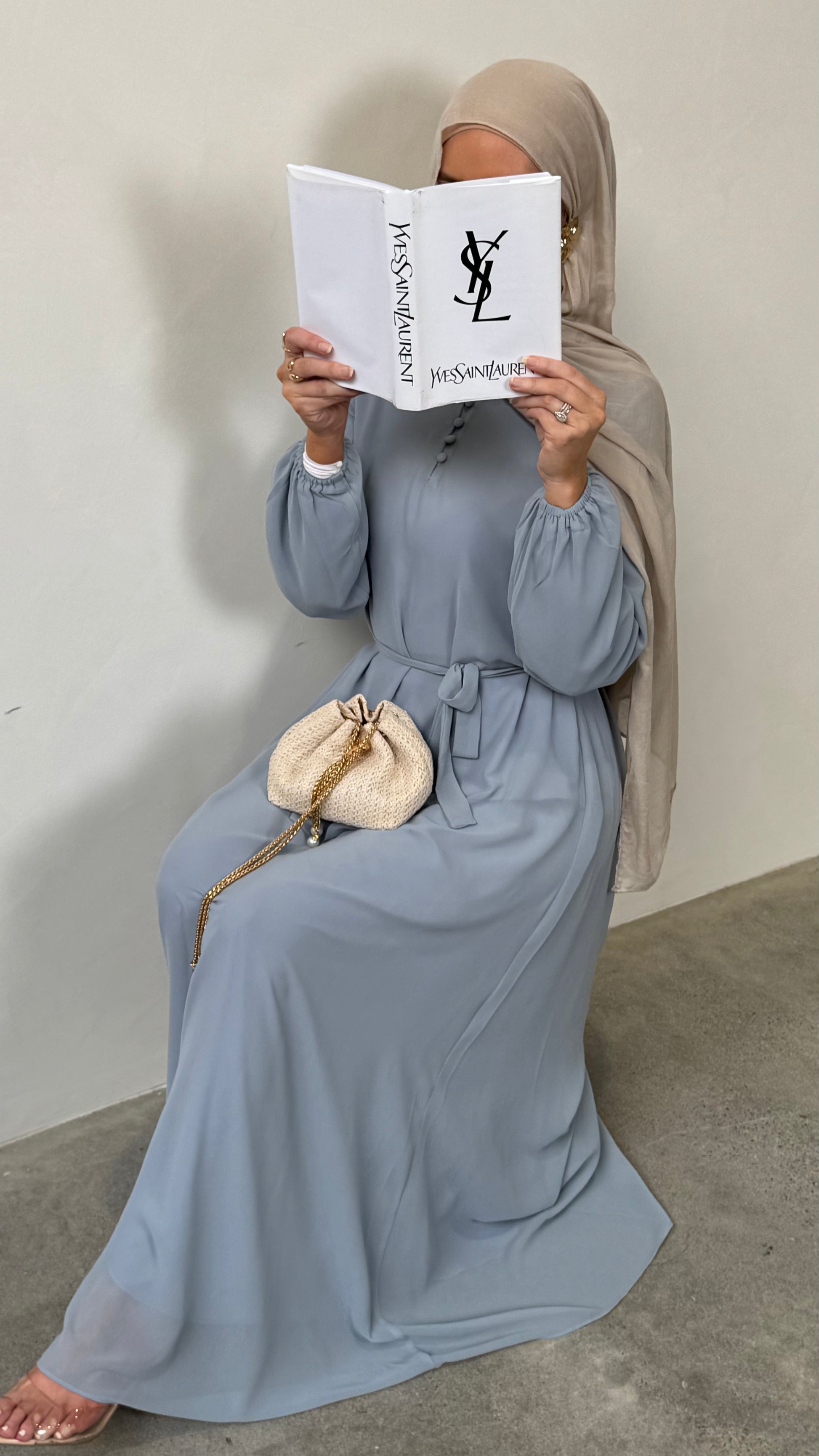 Introducing the 'Amara' Maxi Smock Dress, your new summer staple for effortless elegance! Crafted from a buttery-soft chiffon and fully lined for your comfort, this dress drapes beautifully, offering a lightweight option perfect for sunny days. With its chic balloon sleeves and flowing silhouette, this versatile maxi dress is ideal for any occasion. The stunning blue with a grey undertone adds a sophisticated touch that elevates your summer wardrobe. Step out in style and grace with the Amara, a must-have piece for your collection!
